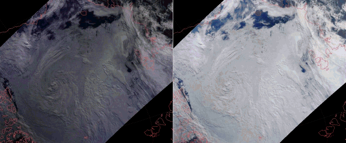 MODIS true-color images on its web page. In the figure below, the image on the left was produced with simple byte scaling, while the image on the right was produced