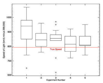 cgBoxPlot, data, XTITLE='Experiment Number', YTITLE='Speed of Light'