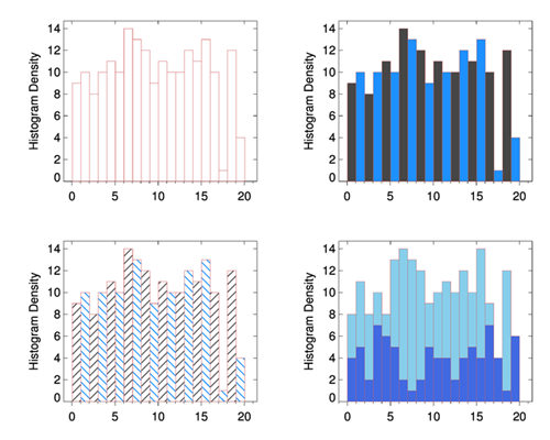 cgHistoplot, data [, /ADDCMD] [, AXISCOLORNAME=string] [, BACKCOLORNAME=string] [, BINSIZE=BINSIZE] [, CHARSIZE=float] [, COLOR=string] [, DATACOLORNAME=string] [, FILENAME=string] [, /FILLPOLYGON] [, /FREQUENCY] [, HISTDATA=HISTDATA] [, /L64] [, LAYOUT=integer] [, /LINE_FILL] [, LINE_THICK=integer] [, LOCATIONS=LOCATIONS] [, /LOG] [, MAXINPUT=MAXINPUT] [, MAX_VALUE=MAX_VALUE] [, MIN_VALUE=MIN_VALUE] [, MININPUT=MININPUT] [, MISSING=MISSING] [, /NAN] [, NBINS=integer], NOERASE=NOERASE [, OL_STYLE=integer] [, OMAX=OMAX] [, OMIN=OMIN] [, /OPLOT] [, /OPROBABILITY] [, ORIENTATION=float] [, OUTFILENAME=string] [, /OUTLINE] [, OUTPUT=string] [, PATTERN=PATTERN] [, PEAK_HEIGHT=PEAK_HEIGHT] [, POLYCOLOR=string] [, POSITION=fltarr] [, PROBABILITY_FUNCTION=float] [, PROBCOLORNAME=string] [, PROBTHICK=float] [, REVERSE_INDICES=REVERSE_INDICES] [, /ROTATE] [, SMOOTH=integer] [, SPACING=SPACING] [, THICK=integer] [, TITLE=string] [, /WINDOW] [, XTICKNAMES=string] [, XTICKFORMAT=string] [, XTICKS=integer] [, XTICKVALUES=XTICKVALUES] [, XTITLE=string] [, YTICKNAMES=string] [, YTICKFORMAT=string] [, YTICKS=integer] [, YTICKVALUES=YTICKVALUES] [, YTITLE=string] [, _REF_EXTRA=_REF_EXTRA]