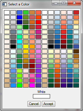 Bottomis set equal to 256-NCOLORS-1. brewer: in, optional Previously used to select Brewer colors. No longer in use, as the Brewer colors are loaded automatically. cancel: out, optional, type=integer On exit, this keyword value is set to 0 if the user selected the ACCEPT button. IF the user selected the CANCEL button, or closed the window in any other way, this keyword value is set to 1. columns: in, optional, type=integer, default=12 Set this keyword to the number of columns to use in the color display. filename: in, optional, type=string The name of an ASCII file that can be opened to read in color values and color names. There should be one color per row in the file. Please be sure there are no blank lines in the file. The format of each row should be:Color values should be between 0 and 255. Any kind of white-space separation (blank characters, commas, or tabs) are allowed. The color name should be a string, but it should NOT be in quotes. A typical entry into the file would look like this:redValue greenValue blueValue colorNamegroup_leader: in, optional, type=long This keyword identifies a group leader if the program is called from within a widget program. Note that this keyword *must* be provided if you want to guarantee modal widget functionality. (If you don't know what this means, believe me, you WANT to use this keyword, always.) index: in, optional This keyword identifies a color table index where the selected color is to be loaded when the program exits. The default behavior is to restore the input color table and NOT load a color. title: in, optional, type=string, default="Select a Color" This keyword accepts a string value for the window title.255 255 0 Yellow- Cancel
