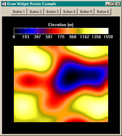 Here is a fairly simple example program, named Draw_Resize_Buttons, that illustrates the concept. The program has a row of buttons (which don't do anything) in the top-level base along with the draw widget. When the program first comes up, it looks like this: